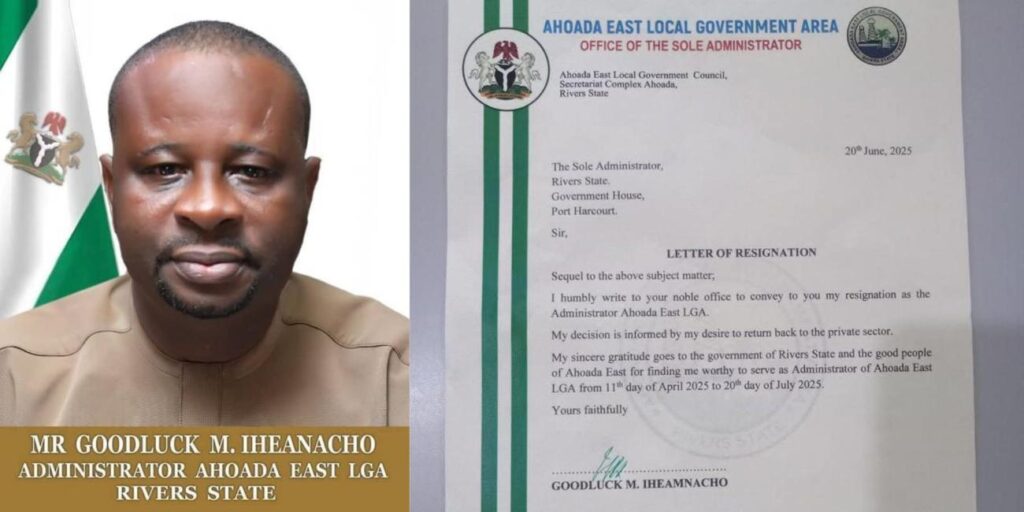 Iheanacho’s resignation letter, dated June 20, 2025, was written on Ahoada East Local Government Area letterhead and addressed to the Sole Administrator of Rivers State.